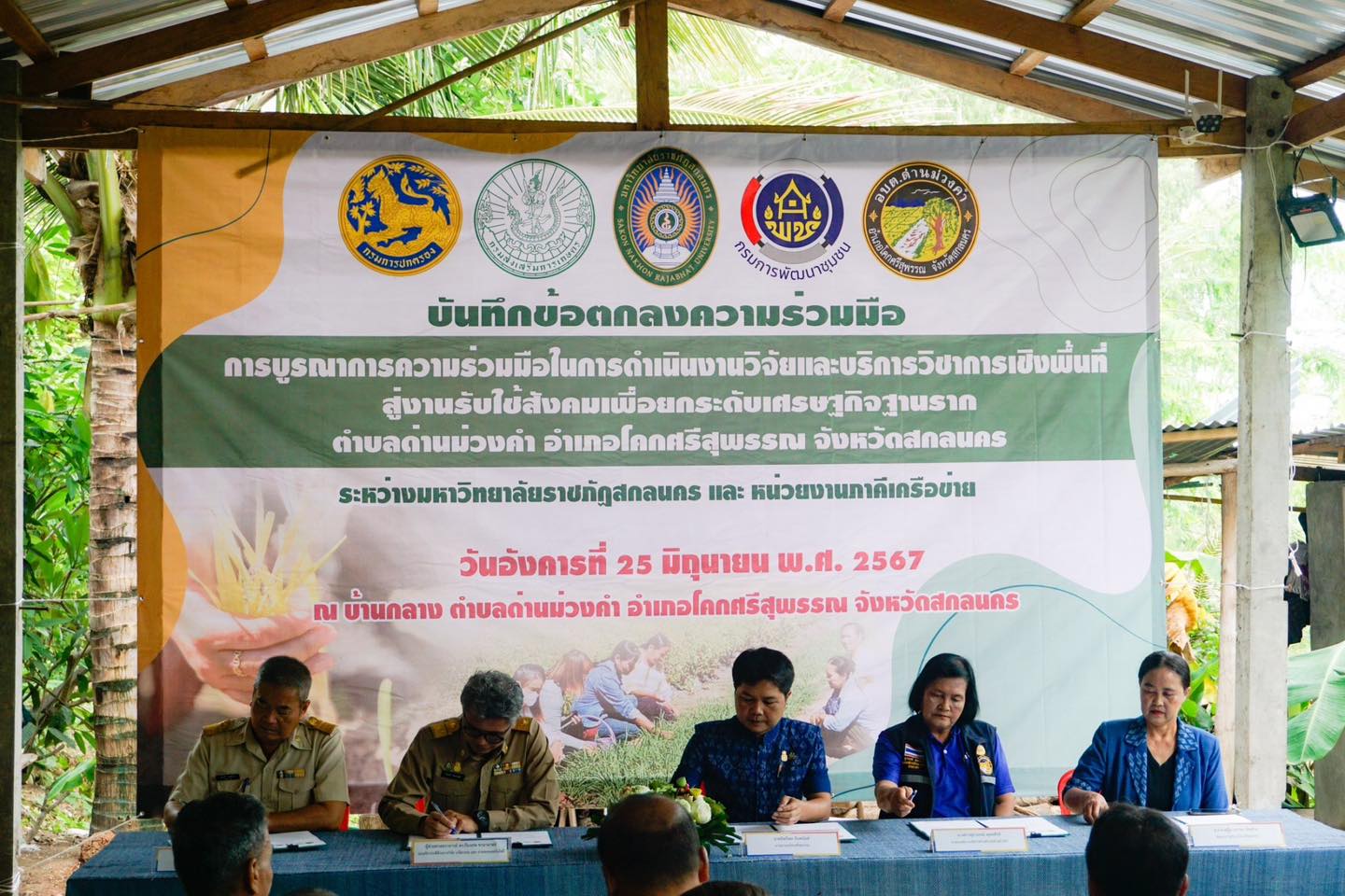 วันที่ 25 มิถุนายน 2567 รศ.ดร.วิลารรณ์ คำหาญ หัวหน้าศูนย์วิทยาศาสตร์บรรยากาศและอวกาศ ร่วมเป็นเกียรติในพิธีลงนามบันทึกข้อตกลงความร่วมมือทางวิชาการ “การบูรณาการความร่วมมือในการดำเนินงานวิจัยและบริการวิชาการเชิงพื้นที่สู่งานรับใช้สังคมเพื่องยกระดับเศรษฐกิจฐานราก ตำบลด่านม่วงคำ อำเภอโคกศรีสุพรรณ จังหวัดสกลนคร” การดำงานระหว่างมหาวิทยาลัยราชภัฏสกลนคร และหน่วยงานภาคีเครือข่าย ณ บ้านกลาง ตำบลด่านม่วงคำ อำเภอโคกศรีสุพรรณ จังหวัดสกลนคร ทีมนักวิจัยศูนย์ ฯ