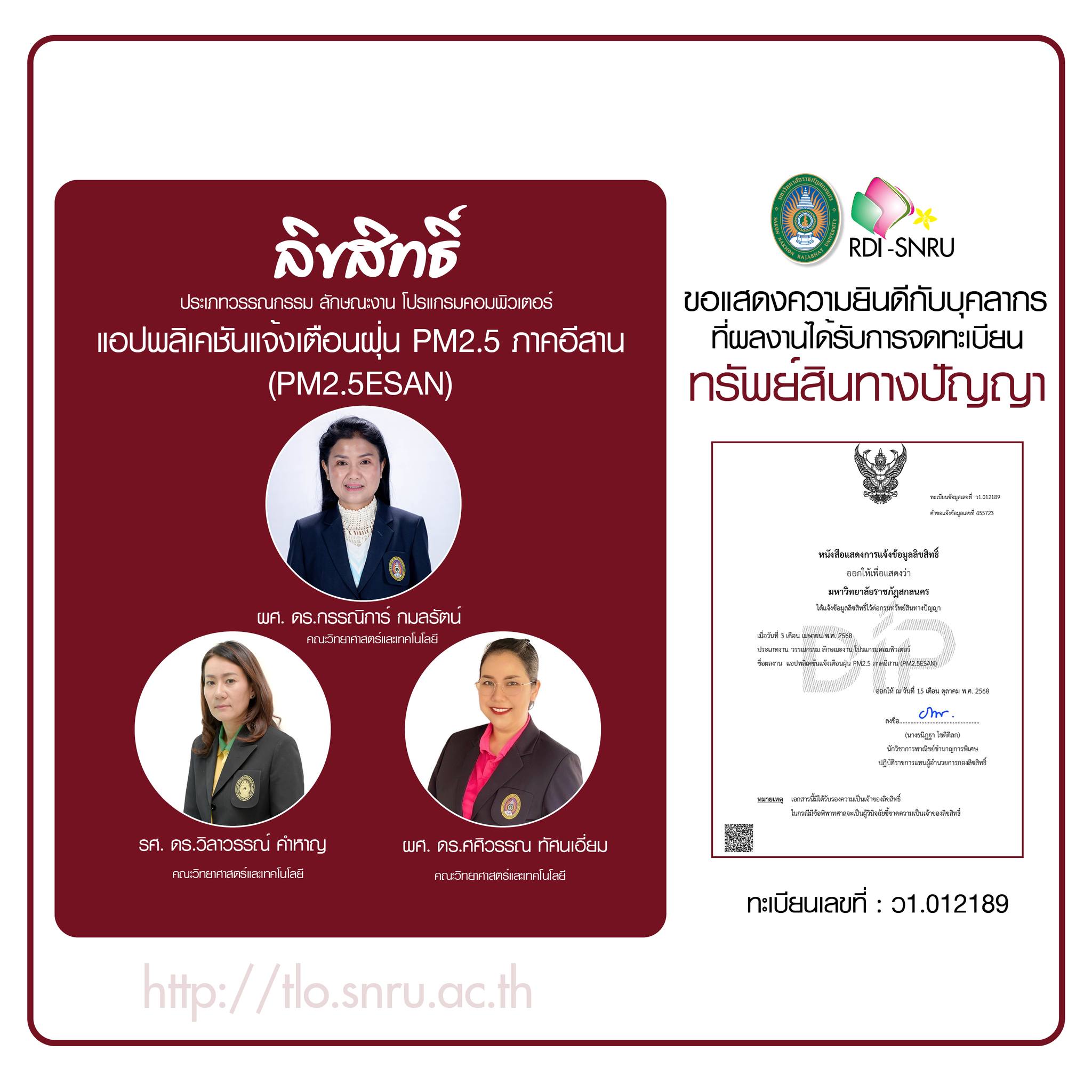 ศูนย์วิทยาศาสตร์บรรยากาศและอวกาศ มหาวิทยาลัยราชภัฎสกลนคร ขอแสดงความยินดีกับนักวิจัยคณะวิทยาศาสตร์และเทคโนโลยี ที่ผลงานได้รับการจดทะเบียนทรัพย์สินทางปัญญา ประเภทลิขสิทธิ์