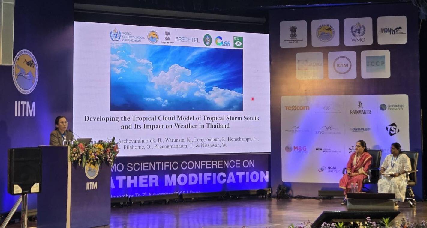 รองศาสตราจารย์ ดร. วิลาวรรณ์ คำหาญ หัวหน้าศูนย์วิทยาศาสตร์บรรยากาศและอวกาศ ได้นำเสนอผลงานวิจัยในหัวข้อ “Developing the Tropical Cloud Model of Tropical Storm Soulik and Its Impact on Weather in Thailand”ในการประชุมวิชาการระดับนานาชาติ The 11th WMO-Conference on Weather Modification ระหว่างวันที่ 3–7 พฤศจิกายน 2568 ณ เมือง Pune ประเทศอินเดีย