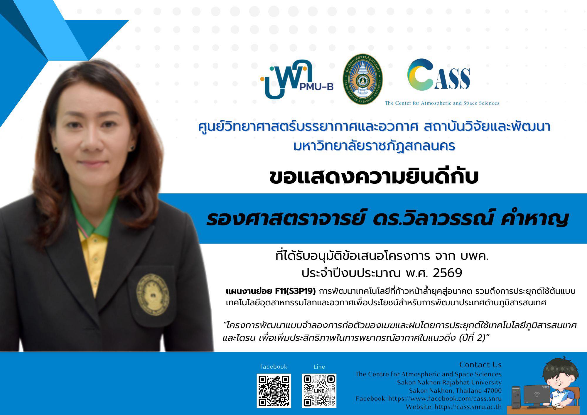 ศูนย์วิทยาศาสตร์บรรยากาศและอวกาศ (CASS) สถาบันวิจัยและพัฒนา มหาวิทยาลัยราชภัฏสกลนคร ขอแสดงความยินดีเป็นอย่างยิ่งกับ รองศาสตราจารย์ ดร. วิลาวรรณ์ คำหาญ